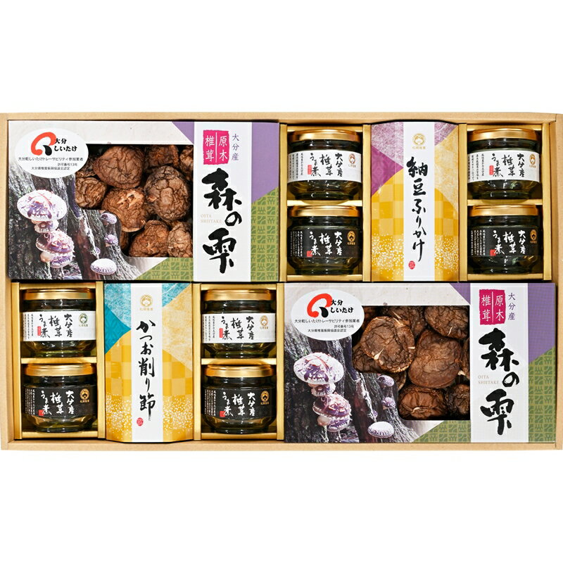 大分産しいたけバラエティギフト内容椎茸うま煮 きざみ -椎茸うま煮 各55g ×各4、大分産原木乾椎茸こうしん 30g ×2、納豆ふりかけ 20g -鹿児島県枕崎産かつお削りぶし 3g×3袋 ×各1商品について食卓に嬉しい「ご飯のおとも」とお料理に使える「和素材」の詰合せ パッケージ変更予定です。